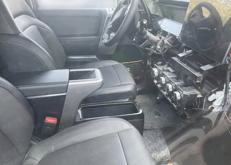The presence of a fuel filler door and temporary exhaust outlet, along with stickers indicating an extended-range system, suggests a departure from the battery-electric setup of the V23. The interior, while similar to the V23, is not finalized.