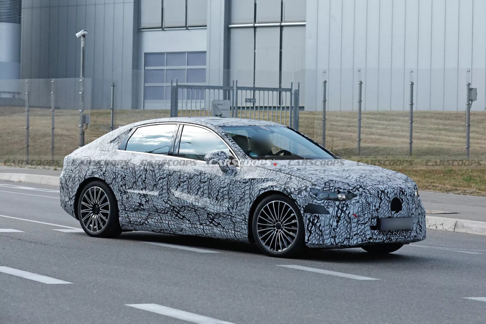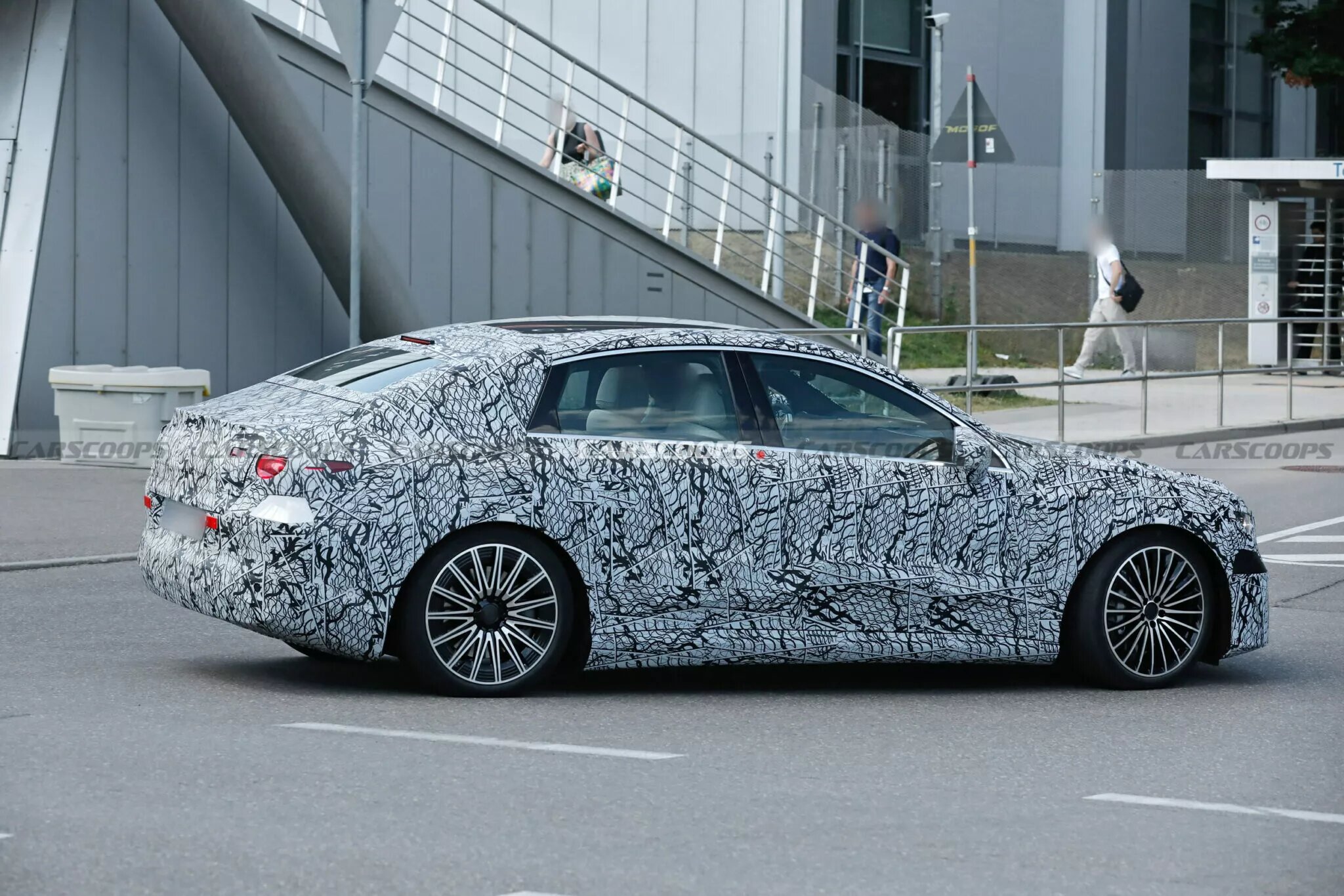 The version featured in this article, however, is a Mercedes-AMG variant—much sportier in nature. This test model includes distinct bumpers, large alloy wheels with perforated brake discs behind them, a small rear spoiler, and a visibly lower stance compared to the standard prototype.