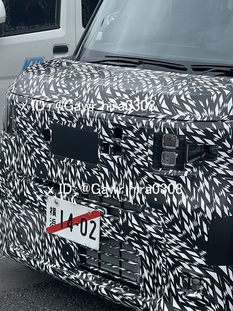Wearing a temporary license plate reading “Yokohama 14-02,” the prototype is heavily camouflaged, but part of the headlight design and grille area is now clearly visible.