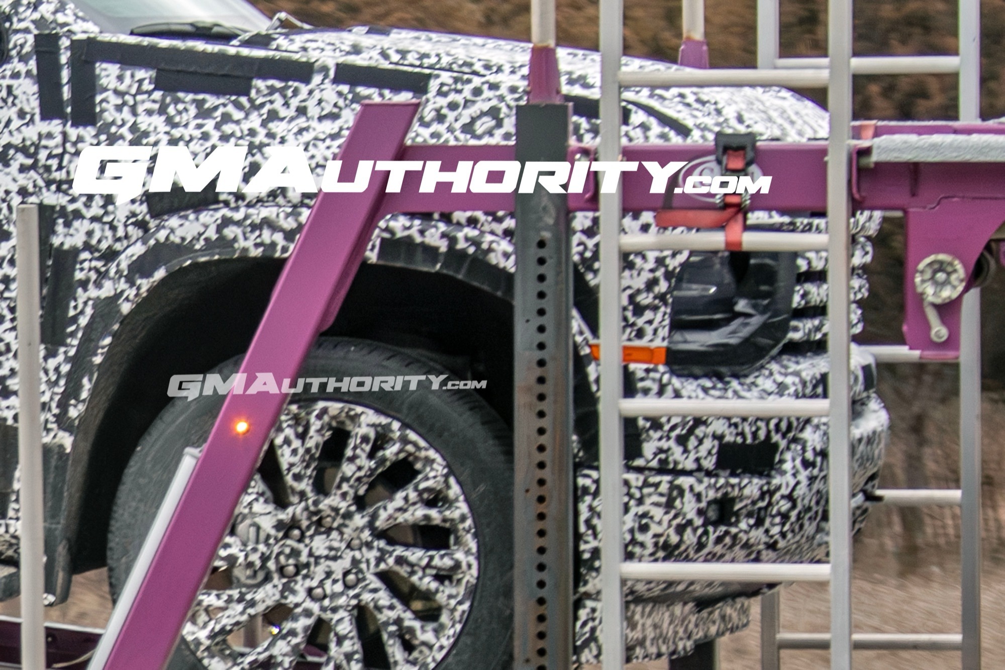 - Front features include production headlights with exposed LED signatures, a thin 10-slat grille, fog lights potentially doubling as cornering lights, and vertically-oriented recovery hooks.