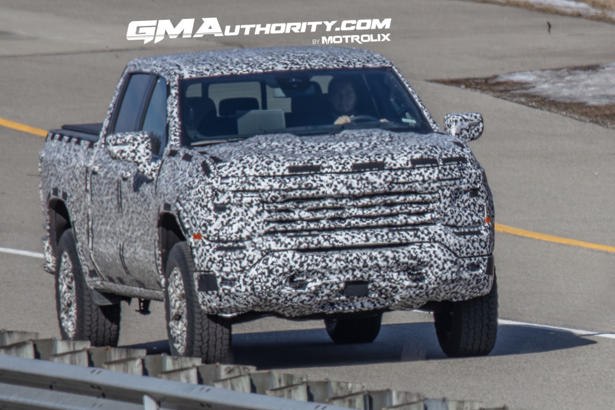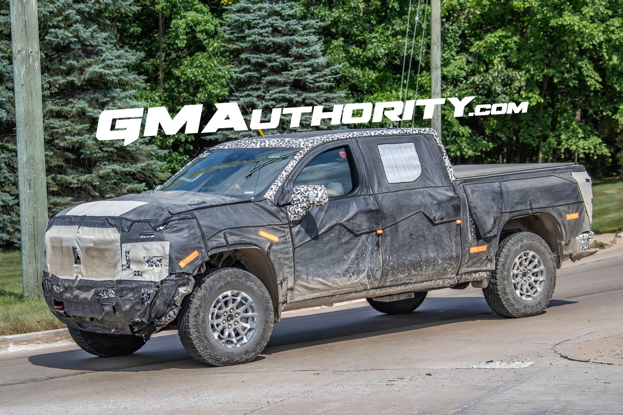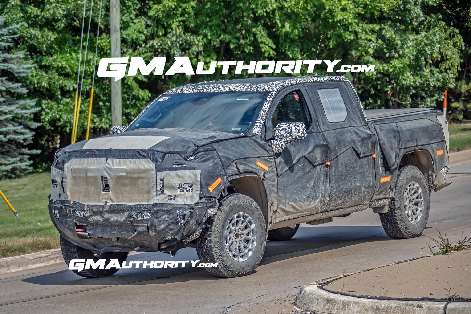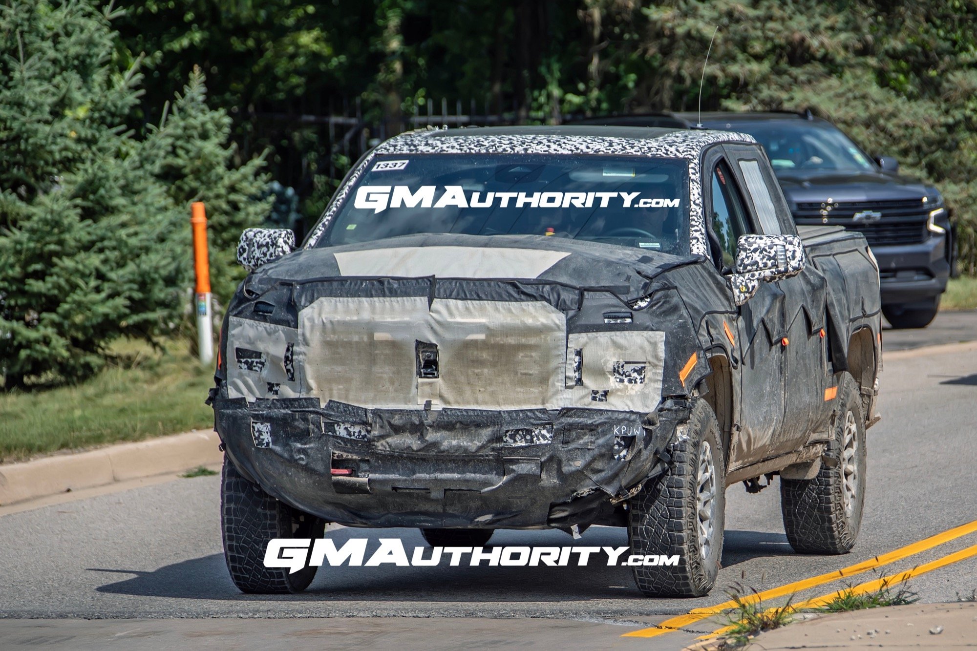 Now, our spies have just caught the very first prototype of what we believe is the 2027 Chevy Silverado While the heavy camo on this truck makes it difficult to figure out whether this is a Chevy or GMC, we have our reasons to to call this a Silverado and not a Sierra. In any event, what we see here is the Crew Cab, Short Box configuration. The upright front end features a set of placeholder (non-production) headlamps bookending a grille with at least four horizontal slats and a front-facing camera peeking out from behind the cutout in the camo. Note that the headlamps are mounted quite a bit lower within the front fascia than those on the current Silverado 1500.