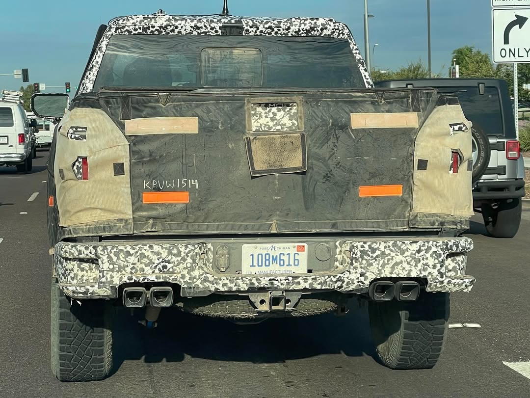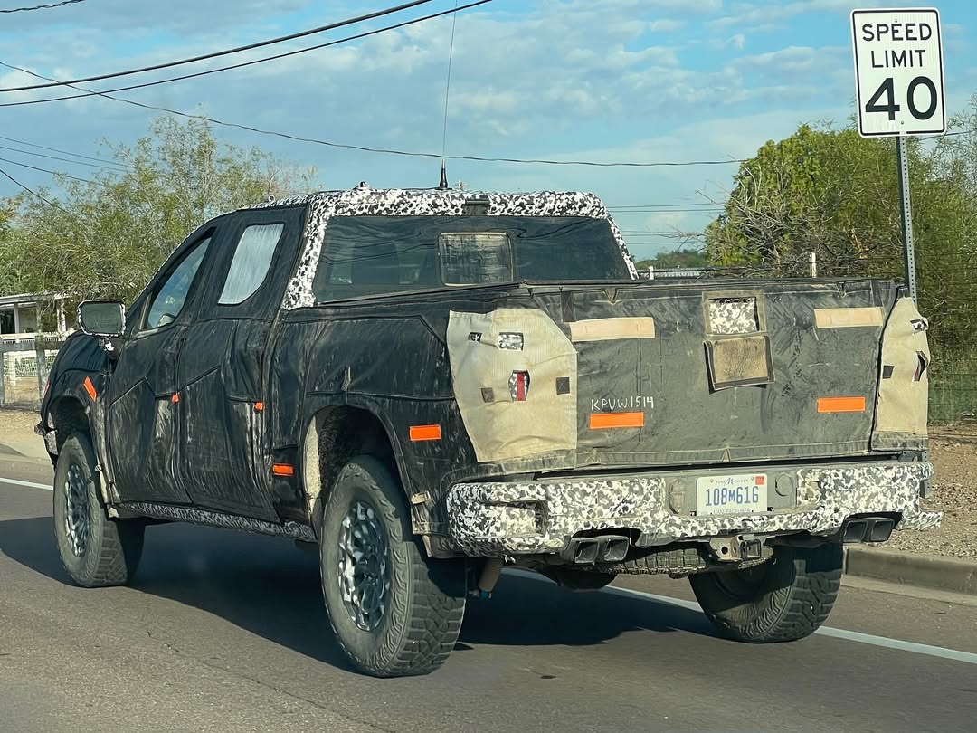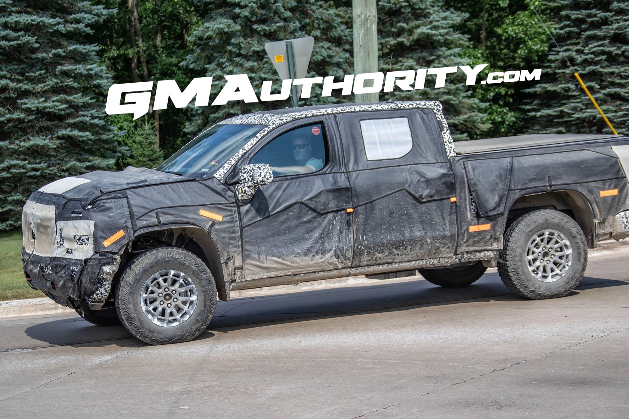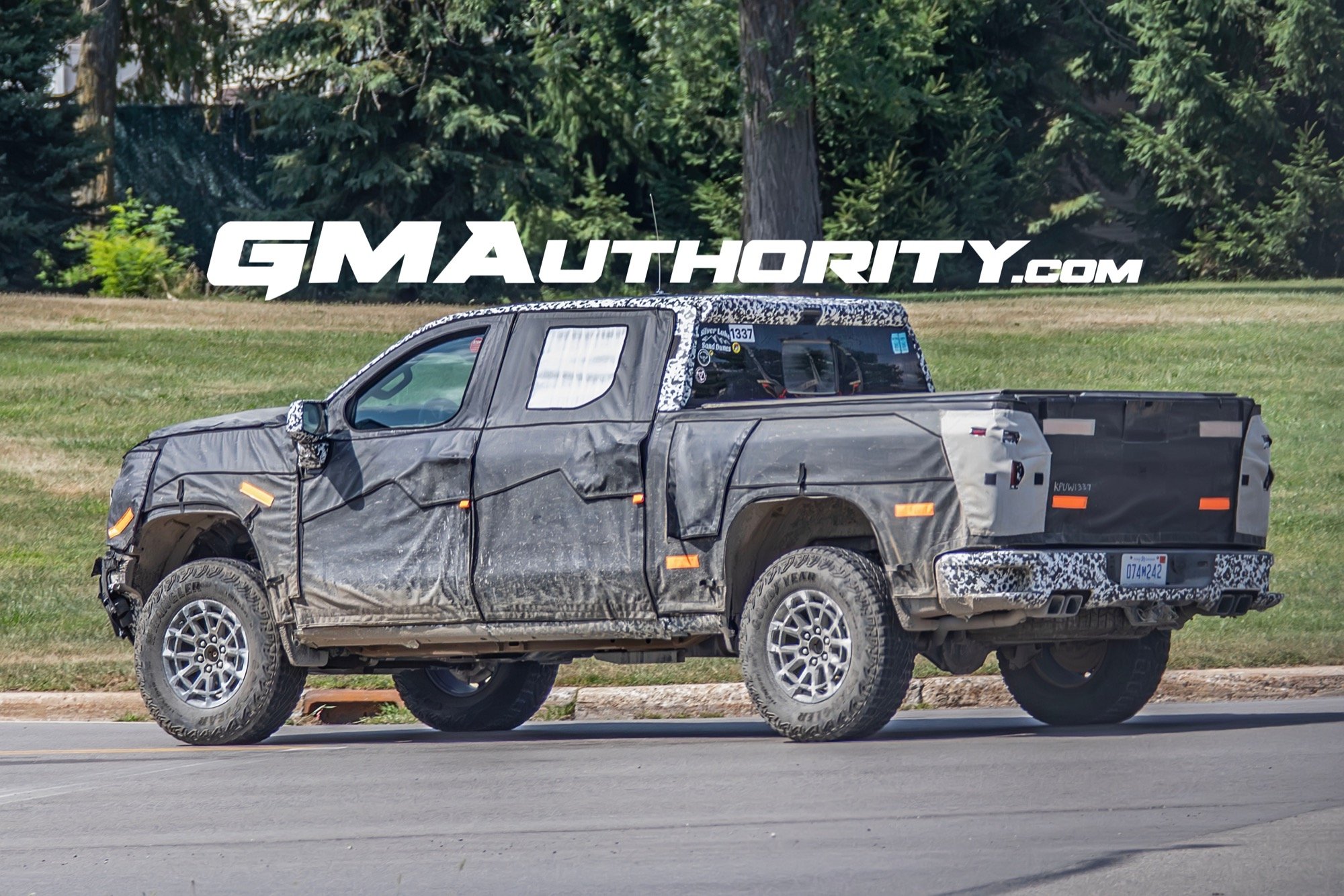 Now, our spies have just caught the very first prototype of what we believe is the 2027 Chevy Silverado While the heavy camo on this truck makes it difficult to figure out whether this is a Chevy or GMC, we have our reasons to to call this a Silverado and not a Sierra. In any event, what we see here is the Crew Cab, Short Box configuration. The upright front end features a set of placeholder (non-production) headlamps bookending a grille with at least four horizontal slats and a front-facing camera peeking out from behind the cutout in the camo. Note that the headlamps are mounted quite a bit lower within the front fascia than those on the current Silverado 1500.