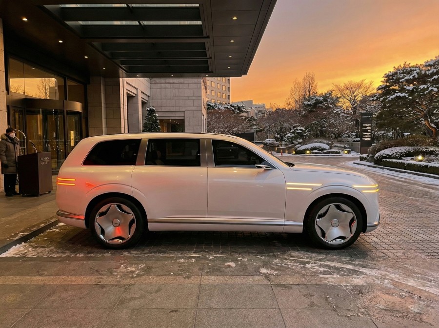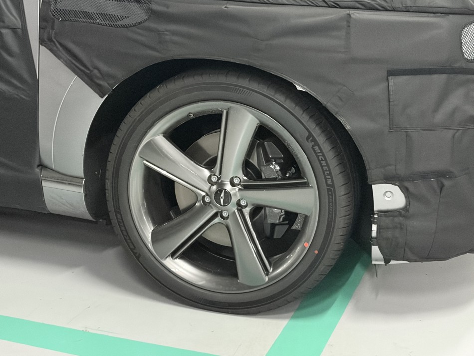 Genesis GV90 test car with lowered ground clearance.