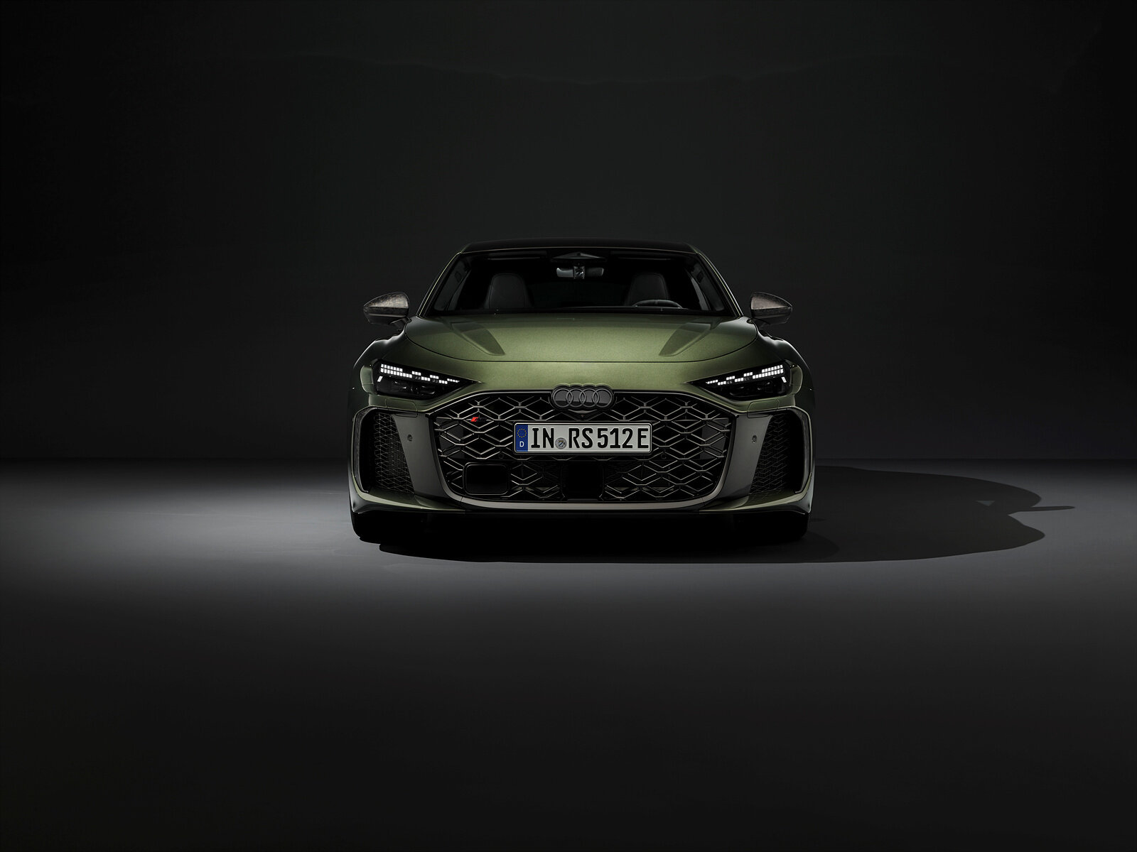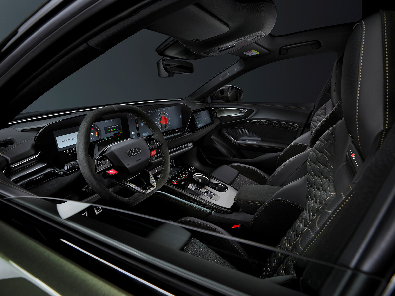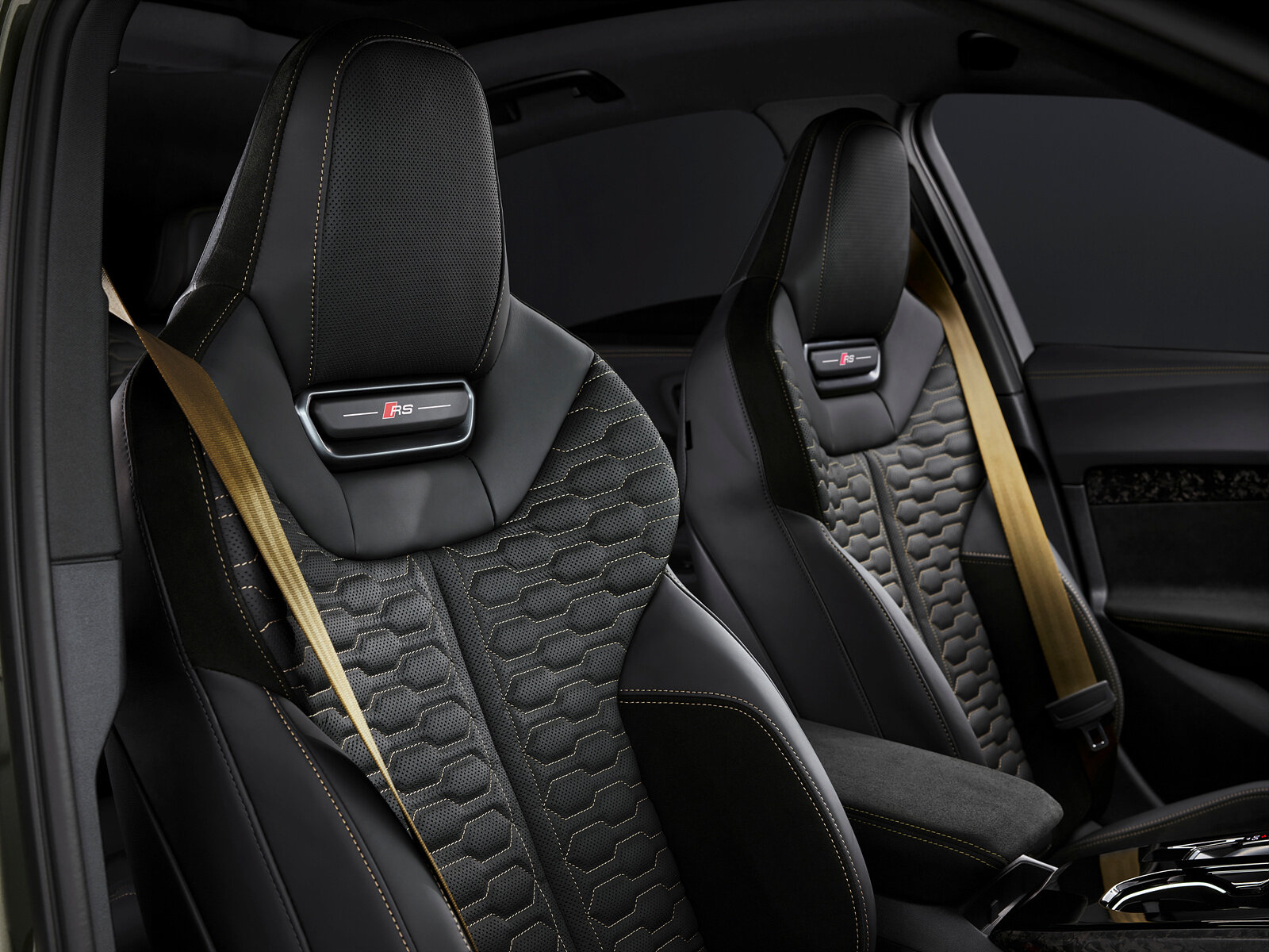 The exclusive interior captivates with an absolutely athletic appearance. The leather seats are accented with Dinamica in deep black on the seat and backrest side bolsters, while Dinamica in deep black also dominates the remaining interior surfaces including the steering wheel. Brass-colored accents and contrast stitching in Serpentine green create striking contrasts – the color is offered for the first time. The seat stitching with honeycomb quilting, seat belts, floor mat stitching with RS logo, and steering wheel with specific 6 o’clock insert are exclusively accentuated in this color for the Audi Sport package.