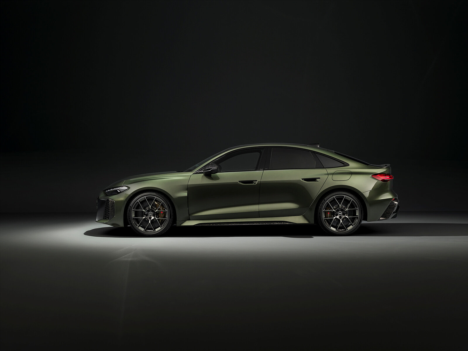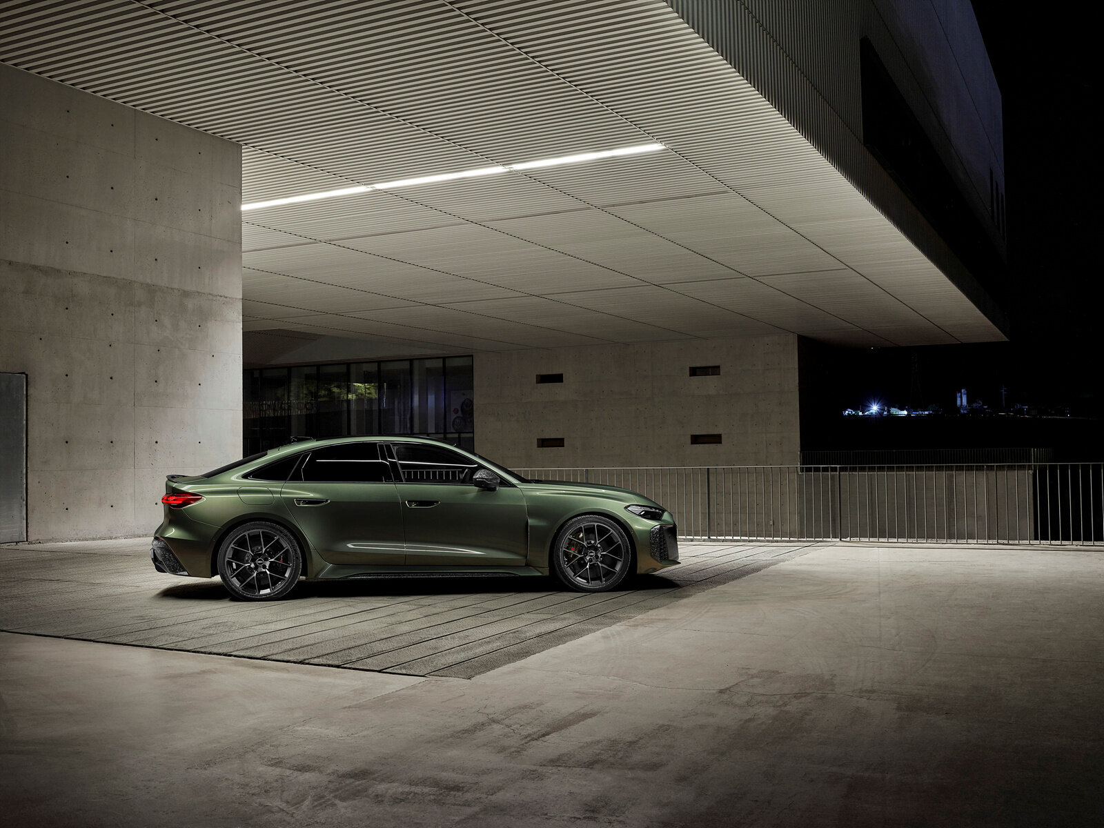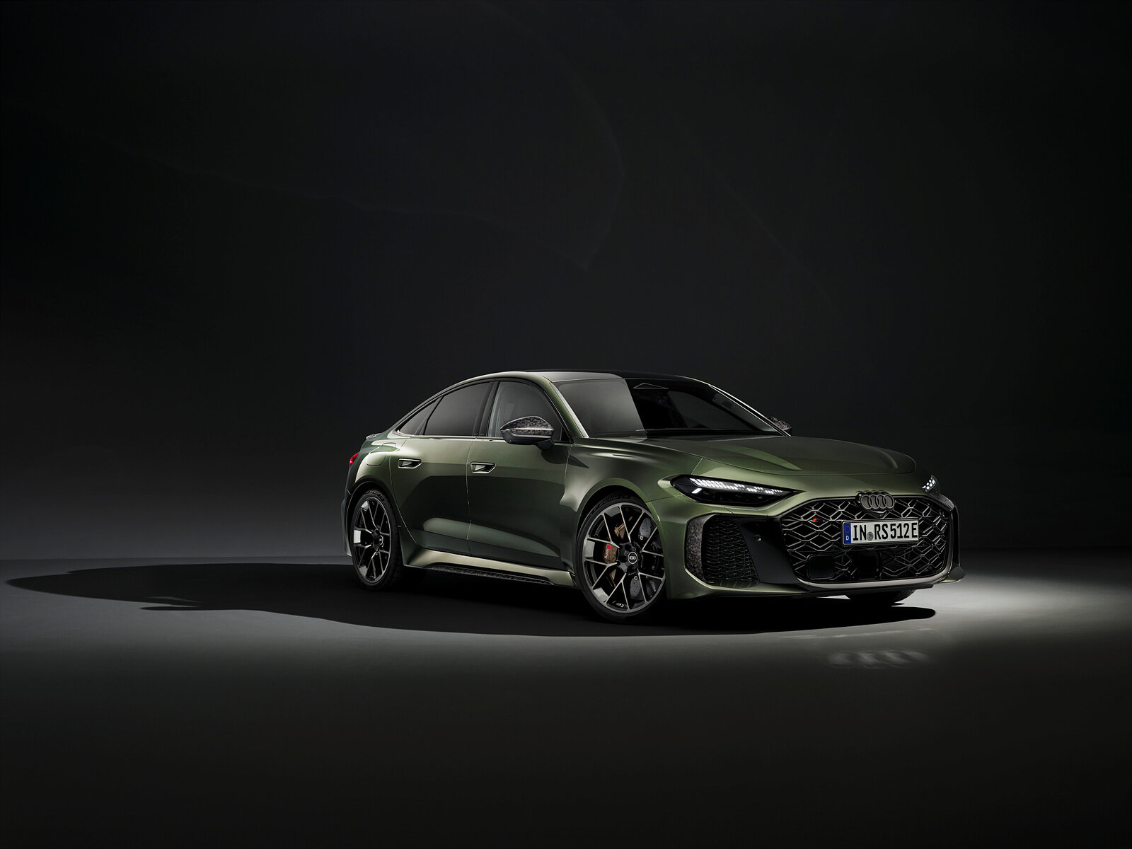 The exclusive interior captivates with an absolutely athletic appearance. The leather seats are accented with Dinamica in deep black on the seat and backrest side bolsters, while Dinamica in deep black also dominates the remaining interior surfaces including the steering wheel. Brass-colored accents and contrast stitching in Serpentine green create striking contrasts – the color is offered for the first time. The seat stitching with honeycomb quilting, seat belts, floor mat stitching with RS logo, and steering wheel with specific 6 o’clock insert are exclusively accentuated in this color for the Audi Sport package.