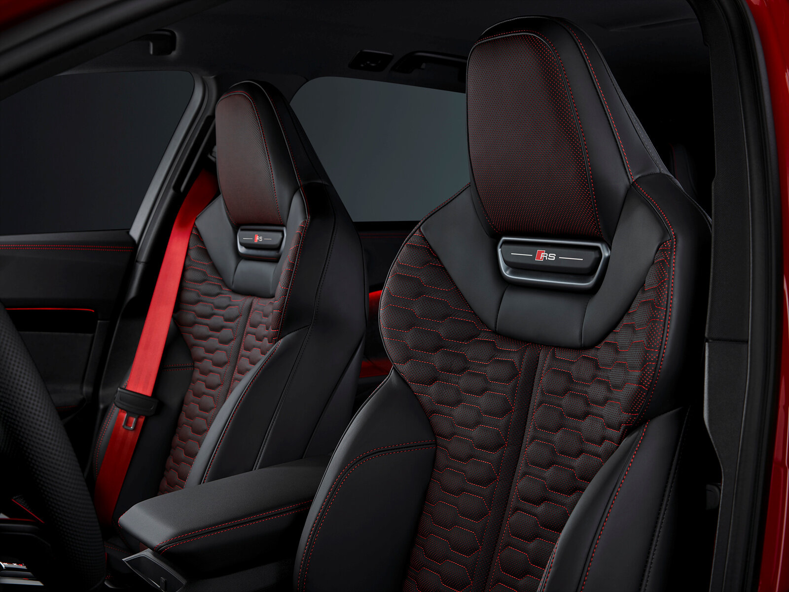 Contributing to the athletic ambiance are highlight surfaces throughout the interior, finished as standard in dark metallic vanadium. These include the shift paddles, Audi emblem and steering wheel clasp, door handles, door sill inlays, air vents, and – exclusive to RS – the illuminated seat frame trim with RS logo.
