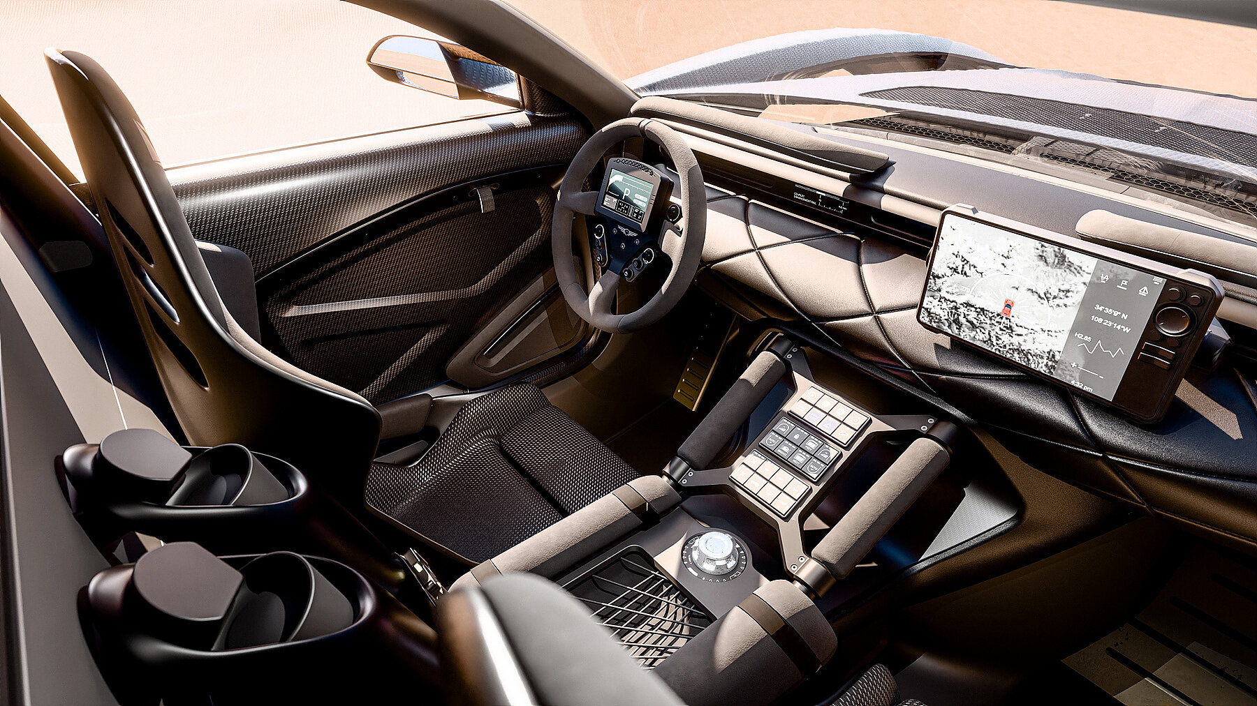 The instrument cluster is incorporated into the steering wheel so drivers can conveniently view it without losing sight of the landscape ahead. The interior is also equipped with a sliding display, which reconfigures between solo-rider and co-piloted modes — a centered position for the driver or sliding to the passenger for copilot navigation. Safety grab handles are prominent touchpoints, ensuring stability during rough movements, while unlimited display adjustability keeps drivers and co-pilots focused on navigating the terrain. Advanced communication systems complete the setup, ensuring seamless coordination even in the most remote environments.