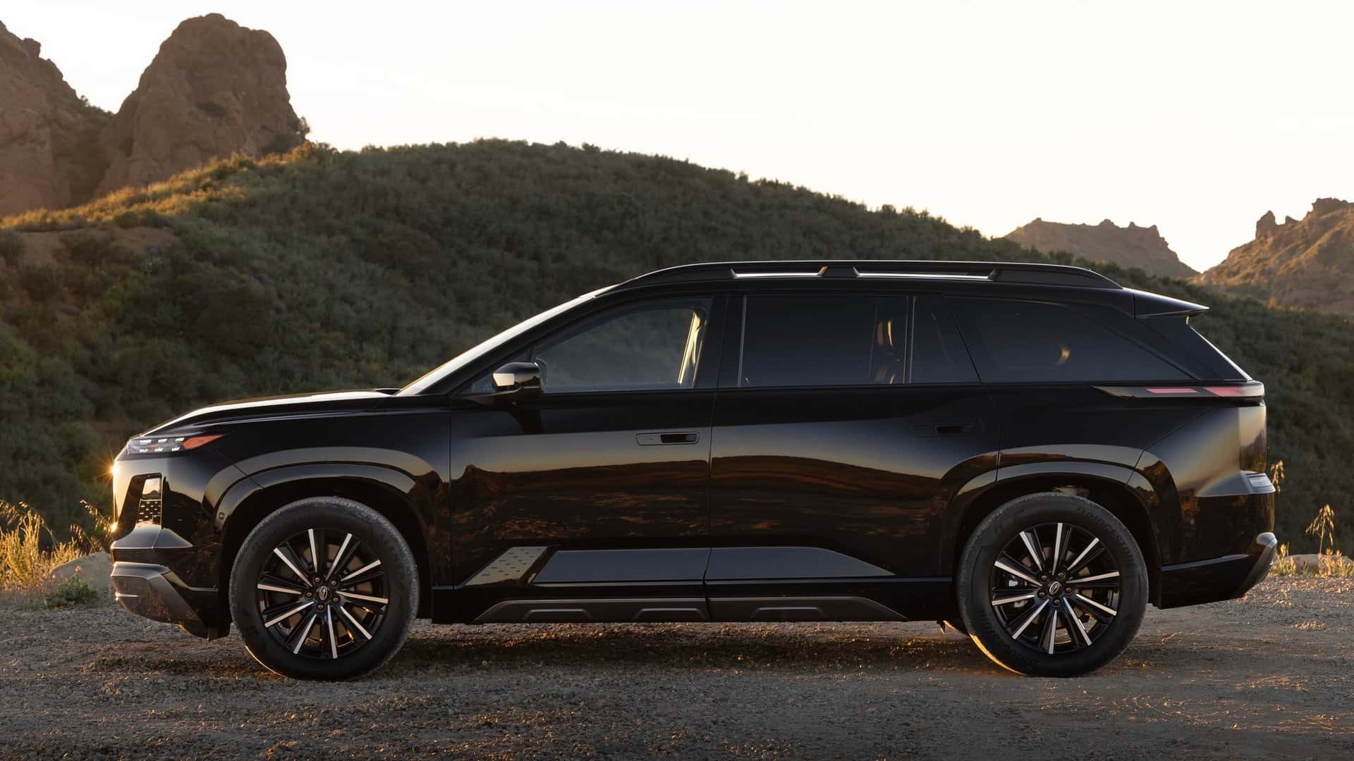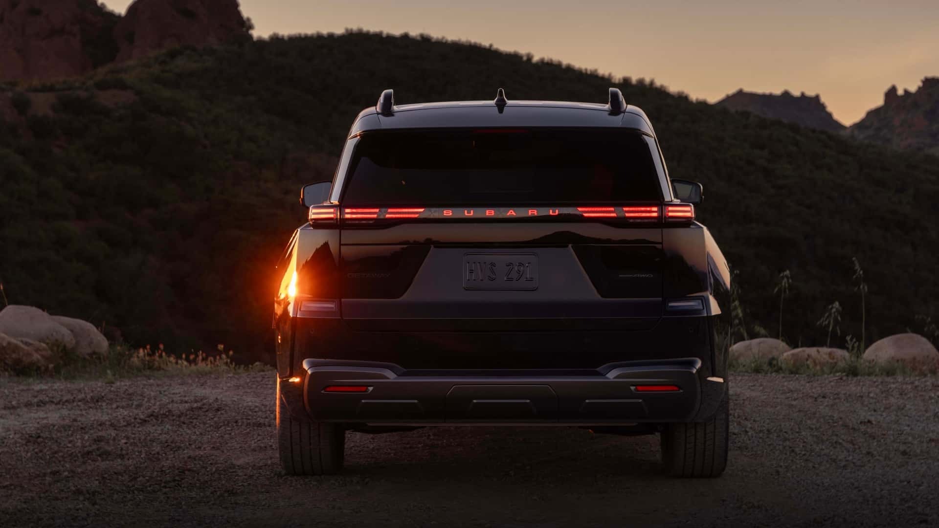 If the Getaway looks familiar, that’s not an accident. It shares its platform with the Toyota Highlander EV, and in profile, the two are nearly indistinguishable — same sheetmetal, same general proportions. But Subaru has carved out its own identity at both ends. Up front, a flat fascia integrates a light-up Subaru logo in place of a conventional grille. Out back, an illuminated SUBARU script bisects what would otherwise be an unbroken lightbar across the liftgate. Unique headlamps and a ladder-style roof rack round out the visual differences.